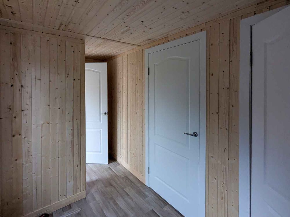 • В данном модульном здании можно заменить базовую внутреннюю отделку, на любой вид внутренней отделки, например: ЛДСП, панели СМЛ или ГВЛО и т.д.